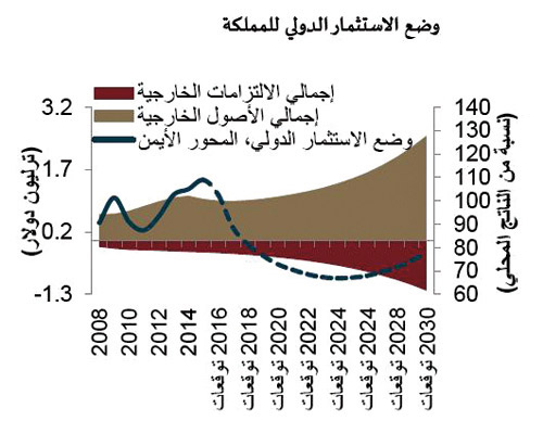 ومن المتوقع كذلك -بحسب التقرير- أن تؤدي الإصلاحات الهيكلية التي ستجري على جوانب رئيسية تتعلق بإنشاء الأعمال في المملكة، كحقوق الملكية، وقوانين سوق العمل، وإنفاذ العقود وغيرها، إلى ارتفاع التدفقات الواردة إلى الحساب المالي المستبعد منه الاحتياطي خلال الخمسة عشر عاماً المقبلة. ونتيجة لذلك التحسن، سيتقلص عجز الحساب المالي المستبعد منه الاحتياطي تدريجياً خلال نفس الفترة، مع استقطاب المملكة للعديد من المستثمرين والدائنين الأجانب. بالإضافة لذلك، سيعمل صندوق الاستثمارات العامة بعد إعادة هيكلته إلى إحداث زيادة كبيرة في الدخل من فئة استثمارات رأس المال في الحافظة مستقبلاً.