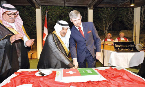 شرّف صاحب السمو الملكي الأمير فيصل بن بندر بن عبدالعزيز أمير منطقة الرياض مساء أمس الأول حفل سفارة جمهورية سويسرا بمناسبة ذكرى اليوم الوطني لبلادها، وذلك بمنزل السفير بحي السفارات في الرياض. وكان في استقبال سموه لدى وصوله سفير جمهورية سويسرا لدى المملكة هاينريخ شيلينبيرغ وعدد من مسؤولي السفارة.