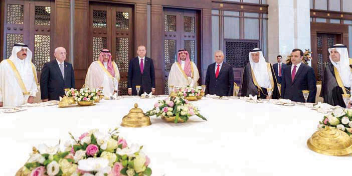 وقد ألقى فخامة الرئيس التركي كلمة أعرب خلالها عن سعادته بمنح سمو ولي العهد وسام الجمهورية في بلاده الذي يقدم لرؤساء الدول الذين يسعون دائما إلى تعزيز العلاقات بين بلدانهم وتركيا، مشيراً إلى أن هذا الوسام يعكس مدى الروابط والعلاقات الوثيقة بين البلدين. وقال فخامته: إنكم قمتم بترسيخ العلاقات التي بُنيت على التاريخ العريق وأخوة البلدين، وفي الوقت الذي تعاني منطقتنا من المآسي والصراعات، كنتم تنشطون في إحلال الأمن والسلام في المنطقة. وأفاد أن تعزيز العلاقات بين البلدين في كافة المجالات من شأنه أن يفتح عددا من الفرص في جميع الميادين. وأضاف فخامته: «إن زيارة سموكم لبلادنا في وقت تمر به في فترة حرجة تعتبر رسالة قوية لمدى وقوفكم وتضامنكم معنا. وأعرب عن شكره لحكومة خادم الحرمين الشريفين الملك سلمان بن عبدالعزيز آل سعود لوقوفها إلى جانب الحكومة التركية خلال فترة الانقلاب.