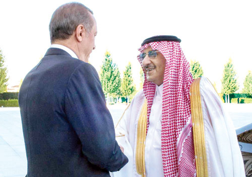 وفور وصول سمو ولي العهد للقصر الرئاسي صحبه فخامة الرئيس التركي إلى مدخل القصر الرئاسي حيث التقطت الصور التذكارية بهذه المناسبة. ثم عقد فخامة الرئيس رجب طيب أردوغان رئيس جمهورية تركيا وصاحب السمو الملكي الأمير محمد بن نايف بن عبد العزيز ولي العهد نائب رئيس مجلس الوزراء وزير الداخلية -حفظه الله- اجتماعا نقل سمو ولي العهد في مستهله تحيات وتقدير خادم الحرمين الشريفين الملك سلمان بن عبدالعزيز آل سعود لأخيه فخامة الرئيس التركي وحرصه أيده الله على تعزيز العلاقات بين البلدين الشقيقين. بعد ذلك جرى استعراض العلاقات بين البلدين، وبحث الموضوعات ذات الاهتمام المشترك، إضافة إلى استعراض تطورات الأوضاع في منطقة الشرق الأوسط والجهود الدولية المبذولة تجاهها.