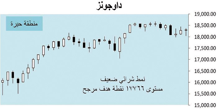 افتتح مؤشر الداوجونز الأسبوع الماضي على حيرة مزعجة حتى نهاية الأسبوع. كانت البداية مع قلق المستثمرين حول سوق السندات، ثم توقعات إفلاس بنك دوتش الألماني، يليه المزيد من بيع النفط بعملات أخرى غير الدولار (نهاية البترودولار). ويرجح الأسبوع المقبل أن يكسر الداوجونز حاجز 18000 نقطة بسهولة، وبتذبذب عالٍ، وقد يكون مستوى الدعم 17766 نقطة منطقة جيدة للمضاربين. لكن بشكل عام الخروج من الحيرة وشيك.