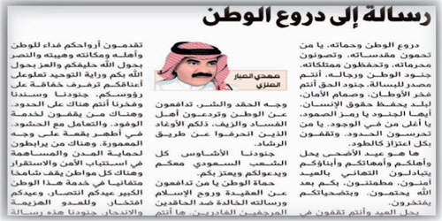 * نشاركك التهنئة لرجال الحزم ورجال التضحية والفداء يحملون أرواحهم على أكفهم جادوا بأرواحهم للذود عن الدين والوطن تحت قيادة خادم الحرمين الملك الحازم سلمان بن عبد العزيز أمد الله في عمره وأدام عليه الصحة والعافية.