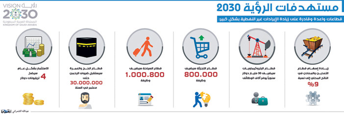 الدراسات أشارت الى ان هناك قطاعات واعدة وقادرة على زيادة الايرادات غير النفطية بشكل كبير.. ومنها قطاع التعدين والمعادن الذي يستهدف البرنامج زيادة إسهامه في الناتج المحلي من 3% الى 9% بحلول العام 2030م.. وقطاع البيتروكيماويات الذي سيضيف 30 مليار دولار الى الناتج المحلي الاجمالي ويوفر آلاف الوظائف وقطاع الصناعة بامكانياته الكبيرة.. وقطاع التجزئة الذي سيضيف 800 ألف وظيفة .. وقطاع السياحة الذي سيضيف مليوناً وثمانمائة وظيفة.. وقطاع الحج والعمرة الذي يستهدف زيادة طاقته الاستيعابية لاستقبال ضيوف الرحمن المعتمرين من 8 ملايين الى 30 مليون معتمر في عام 2030.والاستثمار بشكل عام والذي سيضخ (4) تريليونات دولار.. ولقد قال الأمير محمد بن سلمان: « ان أنجح الرؤى هي التي تبنى على مكامن القوة ومنها ان بلادنا تمتلك قدرات استثمارية ضخمة سنسعى الى ان تكون محركاً لاقتصادنا ومورداً اضافياً لبلادنا».