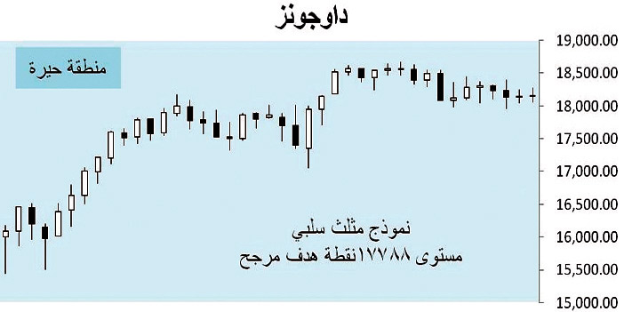 أغلق مؤشر الداوجونز الأسبوع الماضي عند 18161 نقطة، وبنمط بيعي متوسط القوة داخل منطقة حيرة على فاصل الحركة الأسبوعية. وقد لوحظ تشكّل مثلث سلبي، قد يكون إشارة مبكرة إلى أن المنطقة الحالية هي قمة عظمى، تنذر بقرب تصحيح فني قوي، ويرجح الأسبوع المقبل مع ارتفاع الدولار أن تشتد الحيرة، وربما يتم كسر الحاجز النفسي 18000 نقطة للدعم 17788 نقطة؛ والسبب قد يكون ميل المستثمرين للاقتناع برفع الفائدة على العملة.