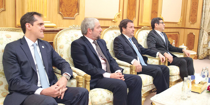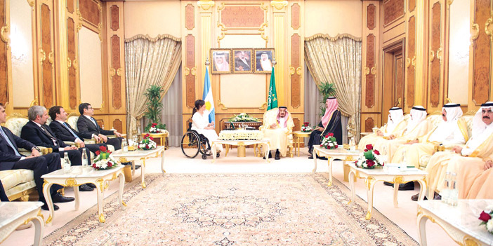 استقبل خادم الحرمين الشريفين الملك سلمان بن عبدالعزيز آل سعود -حفظه الله- في مكتبه بقصر اليمامة أمس، معالي نائبة رئيس جمهورية الأرجنتين غابرييلا ميكيتي، والوفد المرافق لها. ورحب خادم الحرمين الشريفين، بنائبة رئيس جمهورية الأرجنتين، متمنيا لها طيب الإقامة في المملكة، فيما أعربت معاليها عن شكرها لخادم الحرمين الشريفين على ما وجدته من حفاوة استقبال وكرم ضيافة. بعد ذلك عقد خادم الحرمين الشريفين -حفظه الله-، ومعالي نائبة رئيس جمهورية الأرجنتين جلسة مباحثات، جرى خلالها استعراض العلاقات القائمة بين البلدين، وسبل تنميتها وتعزيزها في مختلف المجالات. حضر الاستقبال والمباحثات، صاحب السمو الملكي الأمير فيصل بن بندر بن عبدالعزيز أمير منطقة الرياض، وصاحب السمو الملكي الأمير الدكتور منصور بن متعب بن عبدالعزيز وزير الدولة عضو مجلس الوزراء مستشار خادم الحرمين الشريفين، وصاحب السمو الملكي الأمير متعب بن عبدالله بن عبدالعزيز وزير الحرس الوطني، ومعالي وزير الدولة عضو مجلس الوزراء الدكتور مساعد بن محمد العيبان، ومعالي وزير المالية الدكتور إبراهيم بن عبدالعزيز العساف، ومعالي وزير الدولة عضو مجلس الوزراء وزير الثقافة والإعلام بالإنابة الدكتور عصام بن سعد بن سعيد، ومعالي وزير البيئة والمياه والزراعة المهندس عبدالرحمن بن عبدالمحسن الفضلي الوزير المرافق، ومعالي وزير الدولة للشؤون الخارجية الدكتور نزار بن عبيد مدني. كما حضرها من الجانب الأرجنتيني، السفير لدى المملكة جايمي سيرجيو سردا، وسكرتير السياسة الاقتصادية وتخطيط التنمية بوزارة الخزانة والمالية العامة بدرو لاكوستي، والمدير العام للعلاقات الدولية في نيابة رئاسة الجمهورية خوسيه اورتيز امايا، ووكيل التجارة الخارجية في وزارة الإنتاج شونكو روخاس.