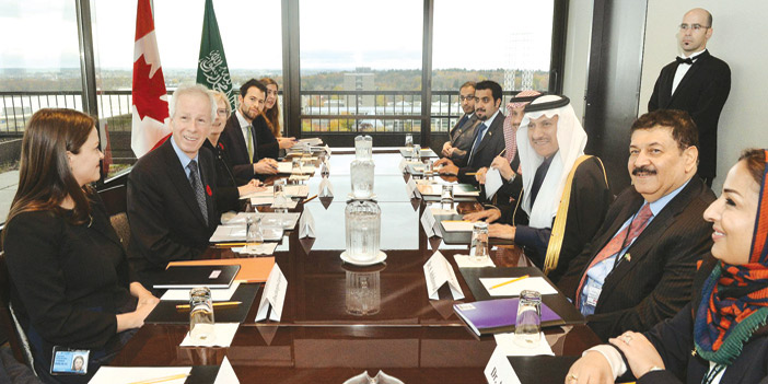 حضر الاجتماع سفير خادم الحرمين الشريفين لدى كندا نايف بن بندر السديري ووفد المملكة المشارك في الزيارة.