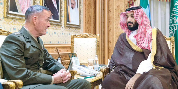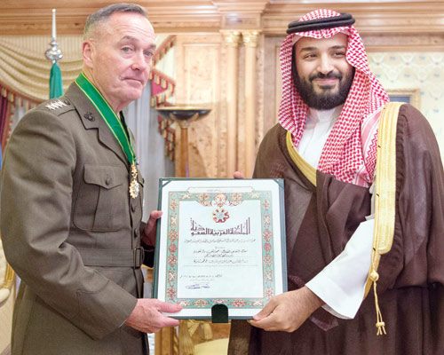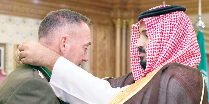 إنفاذاً لأمر خادم الحرمين الشريفين الملك سلمان بن عبد العزيز آل سعود القائد الأعلى لكافة القوات العسكرية، قلد صاحب السمو الملكي الأمير محمد بن سلمان بن عبد العزيز ولي ولي العهد النائب الثاني لرئيس مجلس الوزراء وزير الدفاع في مكتبه بالمعذر أمس رئيس هيئة الأركان المشتركة الأمريكية الفريق أول جوزيف دانفورد وسام الملك عبد العزيز من الدرجة الممتازة.