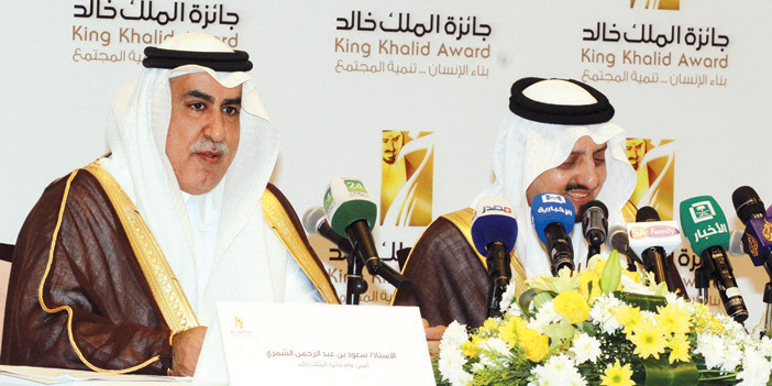 عقب ذلك أجاب سموه عن أسئلة الصحفيين حيث أكد سموه بأن الجائزة تواكب الأوضاع المهمة في المملكة، وأن هذه الجائزة لها إيجابية موضحاً سموه بأن مؤسسة الملك خالد الخيرية حققت أهدافها واستطاعت أن تسهم في العمل الخيري والتنموي وتساهم كذلك في تشجيع القطاع الأهلي والمؤسسات المتميزة، موضحاً سموه بأن فروع الجائزة المطروحة شهدت إقبالاً كبيراً وأن هناك تفاعلا كبيرا ما بين شباب الوطن وهذه المؤسسة الخيرية التي حرص الملك خالد - رحمه الله - أن تكون مؤسسة تعمل داخل الوطن ومن أجل إنسان هذا الوطن ولن تخرج هذه الجائزة التي نخصصها سنوياً لإطار الوطن لأن هدفنا هو الوطن والمواطن وهذا ما نحافظ عليه.