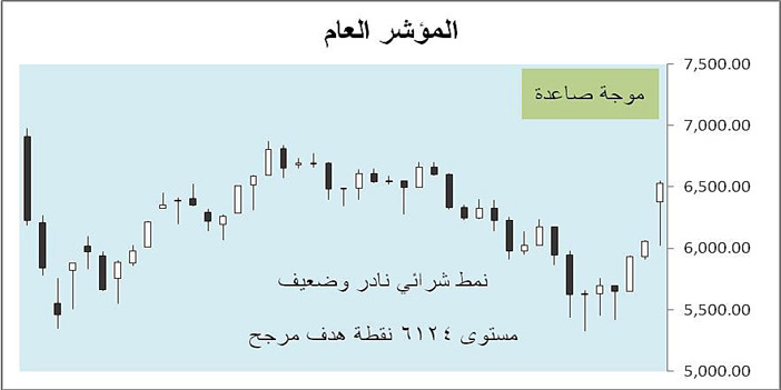 الحديث عن الحركة اليومية والأسبوعية لا يهم؛ لأن المؤشر العام على المدى المتوسط لا يزال هابطًا، ويرجح أنه بصدد تكوين قمة هابطة ثانية شبيهة بالقمة الهابطة عند 9800 نقطة العام الماضي، ولكن تختلف في الشكل، وكسر قاع يناير الماضي في أكتوبر الماضي كان إشارة مبكرة، لكن لو تم اختراق القمة السنوية 6868 نقطة سيكون السوق في موج صاعد لذوي النفس الطويل؛ وعليه يرجح أن يواصل الصعود هذا الأسبوع، ويغلق دون افتتاحه.