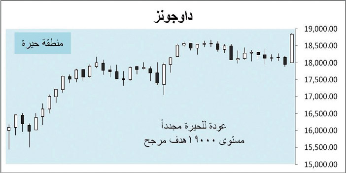افتتح مؤشر الداوجونز الأسبوع الماضي على صعود قوي وصلت قمته عند مستوى 18872 نقطة وأغلق على نمط شرائي قوي لكن داخل منطقة الحيرة على مستوى الحركة الأسبوعية وذلك بعد انتهاء الانتخابات الأمريكية وبسبب صعود قوي للدولار أعطى انطباعًا للمستثمرين أن اقتصاد البلاد سيعود للنمو القوي واستفاد من هذه الموجة الصاعدة قطاع البنوك بشكل كبير يفوق بقية القطاعات ومستوى 19 ألف نقطة هو الهدف المرجح.