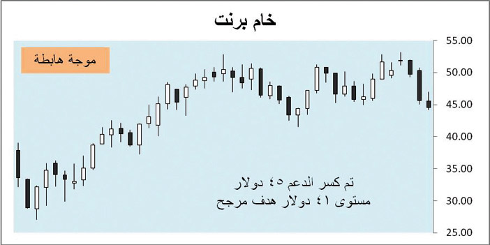 كسر خام برنت مستوى الدعم 45 دولارًا وسجل قاعًا أسبوعيًا عند مستوى 44.21 دولار وذلك بسبب الصعود القوي للعملة الخضراء إلى حاجز 99 أمام سلة عملاتها مدعومة بتوقعات للنمو الأمريكي وتوقعات لرفع أسعار الفائدة مما يرفع من كلفة كل الأصول المقومة بالدولار مثل النفط والذهب، ويرجح الأسبوع المقبل أن يواصل خام برنت هبوطه لقاع أسبوعي جديد عند مستوى 41 دولارًا وقد يكسر الحاجز الأربعيني لو زاد الزخم.
