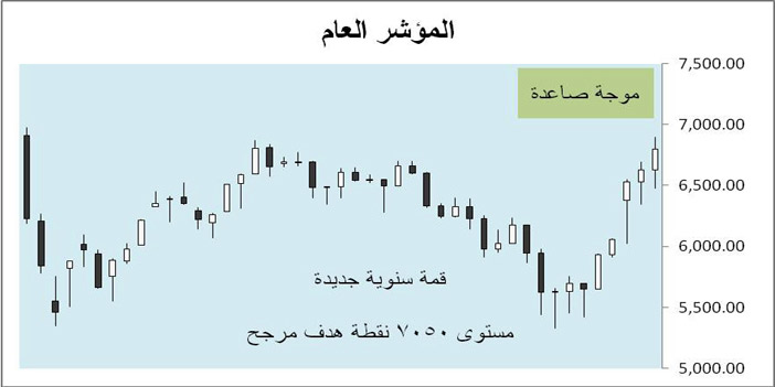 لا يزال المؤشر العام في مساره الصاعد على مستوى الحركة الأسبوعية ولديه إمكانية قد تكون الأخيرة في إختراق حاجز 7000 نقطة وصولا إلى مستوى 7050 نقطة لكن يرجح أن تكون قمة بعزم ضعيف لذا التصحيح وارد في أي وقت والذي يقود السوق الآن هم المضاربون حيث باتت الأسعار غلية نوعا ما وعليه يرجح أن يكون الدعم الأول والأهم هو مستوى 6868 نقطة وهو قريب جداً مما يعطيه حساسية زمنية أكبر من بقية الدعوم.