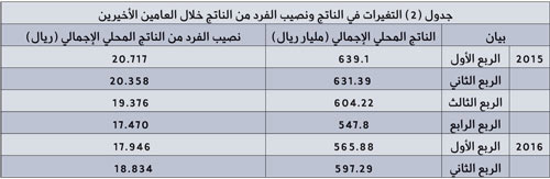 أما على مستوى العامين الأخيرين، فقد سجل نصيب الفرد من الناتج نمواً ملحوظاً في الربع الثاني من عام 2016م، مقارنة بنتائج الربع الأول من هذا العام ونتائج الربع الرابع من العام الماضي، حيث أن تحسناً ملحوظاً بدأ يطرأ على مستوى نصيب الفرد، مع التحسن الواضح في مستوى الناتج المحلي الإجمالي.