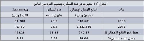 والمتتبع لتطورات نصيب الفرد من الناتج المحلي الإجمالي بالمملكة خلال الـ15 عاماً الأخيرة، يكتشف أن الناتج قد سجل ارتفاعاً من 710 مليار ريال عام 2000م إلى حوالي 2423 ملياراً ريال عام 2015م، أي سجل نمواً بمعدل 241% تقريباً، وهو معدل مرتفع يصل سنوياً إلى حوالي 16.1%، ولكن في المقابل فإن نصيب الفرد من الناتج المحلي الإجمالي لم يتجاوز 8.2%.