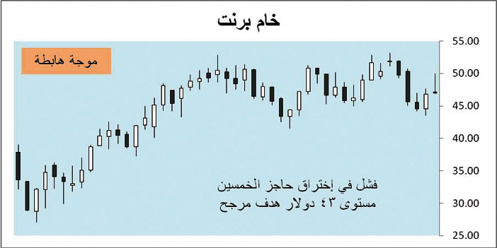 رغم ارتفاع العملة الخضراء وبقاؤها فوق حاجز المائة أمام سلة عملاته إلا أن برنت نجح في بناء موج صاعد قصير لكنه فشل في النهاية في اختراق حاجز الخمسين دولارًا رغم اقترابه كثيرًا منه والسبب يعود لحيرة المضاربين من تصريحات كبار المنتجين المتناقضة، أما المستثمرون لا يزال المعروض أكبر من الطلب وهو المحرك الأساسي للسوق، ويرجح الأسبوع المقبل أن يكسر مستوى 45 دولارًا وقد يجد دعمًا عند مستوى 43 دولارًا.