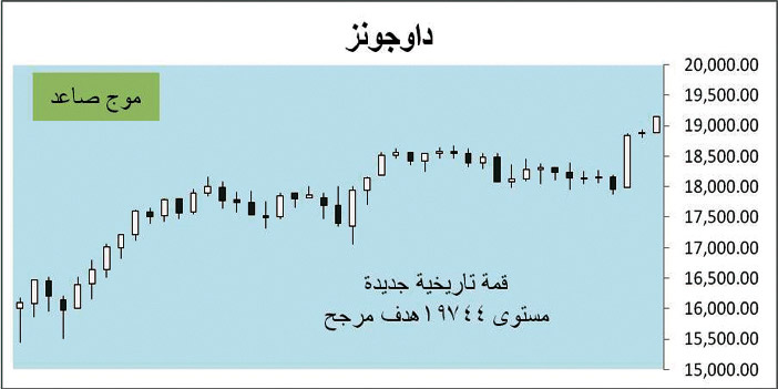 افتتح مؤشر الداوجونز الأسبوع الماضي على صعود وصلت ذروته عند قمة تاريخية جديدة (19146 نقطة) وانتهى الأسبوع بنمط شرائي متوسط والموج صاعد والعزوم ضعيفة للغاية، لكن واقع أكبر سوق أسهم في العالم لا يبرر هذا الأداء خصوصًا مع مخاطر وتداعيات قرار الفدرالي المرتقب بخصوص الفائدة لكن يبدو أن السوق بصدد الوصول للمراحل النهائية للفقاعة وهو مهيأ بشكل كبير في أي أسبوع للتصحيح العنيف.