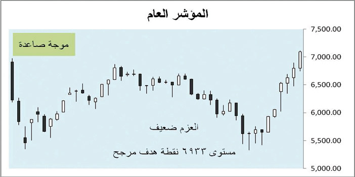 المرجح الأسبوع المقبل أن يدخل السوق في مسار هابط على مستوى الحركة اللحظية ومنطقة حيرة على مستوى الحركة اليومية والدعم بعد جني الأرباح قد يكون مستوى 6933 نقطة والحاجز النفسي 7000 نقطة كسره يتطلب هبوطاً للقطاع المصرفي، وهذا مرجح وعليه مهم الإشارة إلى أن الموجة الصاعدة من 5300 نقطة إلى الآن تعيش مراحلها الأخيرة وتتحرك بدافع من المضاربين (المغامرين) والتصحيح وارد أي وقت.