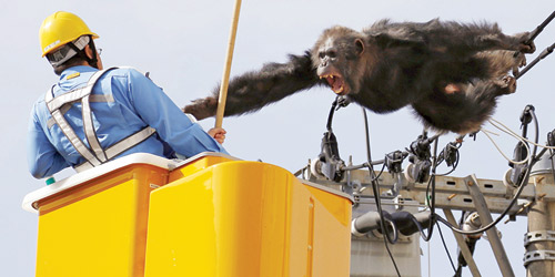 يحاول قرد شمبانزي مهاجمة رجل الإطفاء «خوفاً» بعد محاصرته في خطوط الضغط العالي قرب متنزه ياجياما في سيندي، شمال اليابان (14 أبريل 2016)