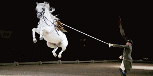 خيل من الأكاديمية الإسبانية يؤدي العروض النهائية في صالة «the SSE Arena» في لندن (10 نوفمبر 2016)