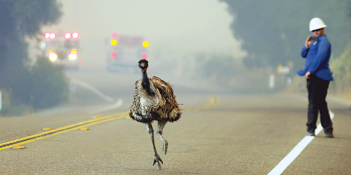 طائر «النعامة» تركض بسرعة، هرباً من حريق كبير قادم خلفها في مدينة كاليفورنيا، (20 يونيو 2016)