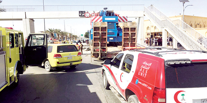 باشرت فرق الدفاع المدني بالرياض صباح أمس الجمعة حادث اصطدام رافعه محمله على لوبد بجسر المشاة بطريق بلال بن رياح بالرياض وقامت فرق الإنقاذ بفك الاحتجاز لشخصين توفي أحدهما في موقع الحادث.. ونقل الآخر للمستشفى؛ وساهمت فرق من المرور بغلق الطريق وتسهيل الحركة المرورية. أعلن ذلك المتحدث الرسمي بالدفاع المدني بالرياض الرائد محمد الحمادي.