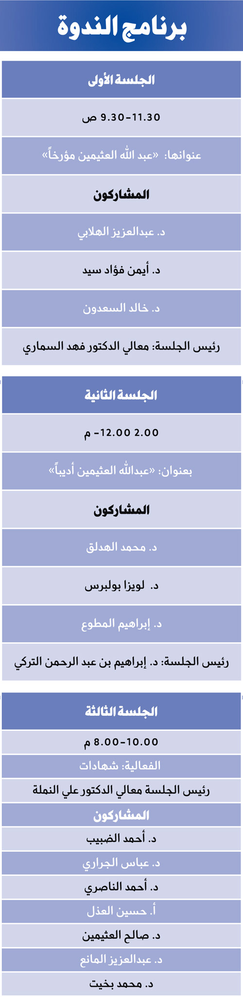 وبمناسبة انعقاد الندوة قال الدكتور عبدالعزيز السبيل أمين عام جائزة الملك فيصل العالمية: إن تنظيم الندوة يأتي تقديراً واهتماماً من صاحب السمو الملكي الأمير خالد الفيصل بالإنتاج العلمي للدكتور عبدالله العثيمين الذي تولى أمانة الجائزة على مدى ثلاثين عاماً، فما سيقدم في الندوة من أبحاث ومواضيع علمية وأدبية عن العثيمين سوف تشكل إضافة علمية للمكتبة السعودية والعربية بجانب مؤلفات العثيمين التي أثرت الثقافة والمعرفة بالعديد من المؤلفات التاريخية والأدبية والمقالات الصحفية، مشيراً أمين عام الجائزة إلى أن الندوة تتضمن ثلاث جلسات عمل، يشارك فيها عدد من الشخصيات الثقافية والأكاديمية من المملكة ومصر والمغرب والعراق، مختتما السبيل حديثه قائلاً: تم توجيه الدعوة لعدد من الباحثين والمهتمين بإنتاج الدكتور العثيمين العلمي والأدبي، كما أن أمانة الجائزة سوف تقوم بطباعة البحوث والشهادات المقدمة في الندوة في كتاب يخلد جهود العثيمين، ويكون بمثابة مرجعاً للباحثين والمهتمين.