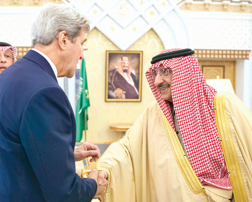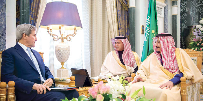 استقبل خادم الحرمين الشريفين الملك سلمان بن عبدالعزيز آل سعود -حفظه الله- في مكتبه بقصر اليمامة بالرياض أمس، معالي وزير الخارجية الأمريكي جون كيري، والوفد المرافق له.
