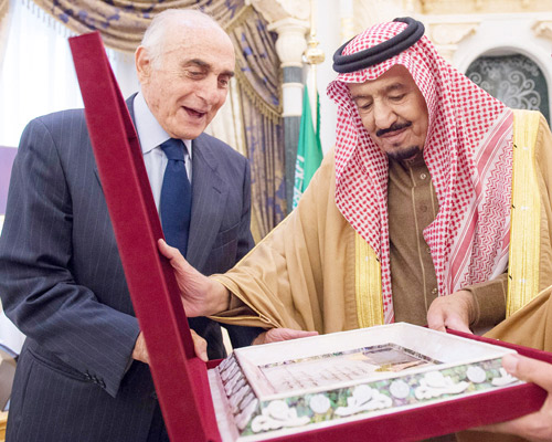 وتسلّم خادم الحرمين الشريفين خلال الاستقبال من رئيس مجلس إدارة صندوق القدس (درع القدس للانتماء والعطاء) تقديرًا وعرفانًا له ـ حفظه الله ـ في دعم ومساندة الشعب الفلسطيني وقضيته العادلة.