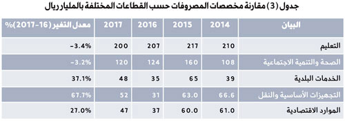 دائماً ما يفسر الاقتصاديون زيادة المصروفات الحكومية في قطاعات معينة بأنها نهج توسعي، وخاصة عندما تصب هذه المصروفات في قطاعات محركة للسوق مثل المقاولات والبناء والتشييد والتشغيل والصيانة.. موازنة 2017 بها عودة لأرقام عهد 2014 وما قبلها من حيث التخطيط لضخ المزيد من المصروفات في قطاعات اقتصادية محركة للنشاط الاقتصادي ككل، والتي على رأسها الخدمات البلدية والتي زادت مخصصاتها بنسبة 37.1% في 2017م عنها في 2016م، وكذلك قطاع البنية الأساسية والنقل والتي زادت مخصصاتها بنسبة 67.7% في 2017م عنها في 2016م، وكذلك قطاع الموارد الاقتصادية والتي زادت مخصصاتها بنسبة 27% في 2017 عنها في 2016م .. وجدير بالذكر أن الإنفاق على التعليم والصحة يعتبر إلى حد كبير لم يطرأ عليه تغيير حيث استقر الأول عند مستوى إنفاق 200 مليار ريال، واستقرت الصحة عند مستوى 120 مليار ريال، وهي تدور حول فلك مستوياتها السابقة.