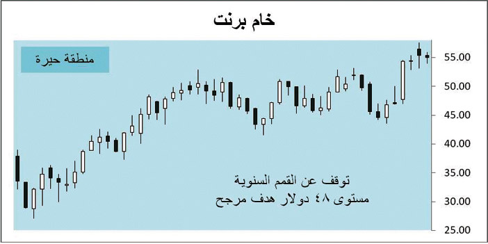 تلقى خام برنت ضغوط كبيرة الأثر الأسبوع الماضي حيث تشكل نمط سلبي قوي إذا ما تم دمج حركة الأسبوع الماضي مع سابقه، وتوقف عن تشييد القمم السنوية ومؤشرات العزم والزخم معظمها ضعيفة مما تشير إلى إمكانية بدء مسار هابط قوي يستهدف بالمرحلة الأولى مستوى 48 دولاراً، ولا يظهر حالياً سبب رئيسي للضعف الفني سوى أن هناك إحتمالية إغلاق مراكز المضاربين مع نهاية الشهر بعد رالي مشترين الشهر الماضي.