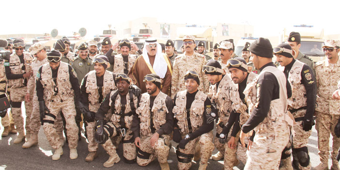 وحول هل لا زال الحرس الوطني قائما بحفظ المنشآت قال سموه لم يعد الحرس الوطني قائماً بذلك وأنا أشكر سمو ولي العهد ووزير الداخلية أخي الأمير محمد بن نايف على جهوده لضم حراسة المنشآت لوزارة الداخلية حتى يتمكن الحرس الوطني من تدريباته ومهامه ونحن في خدمة الوطن في أي مكان. وقد حضر الحفل كل من معالي نائب وزير الحرس الوطني عبدالمحسن التويجري ومعالي مساعد وزير الداخلية للشؤون الأمنية الفريق أول سعيد القحطاني ومعالي رئيس هيئة الأركان العامة الفريق أول عبدالرحمن البنيان ومعالي الفريق أول يوسف الإدريسي نائب رئيس الاستخبارات العامة ومعالي الفريق أول فيصل بن لبدة مستشار وزير الحرس الوطني ووكيل الحرس الوطني للأفواج الأمير خالد بن عياف ومعالي الفريق محمد بن سحيم قائد الدفاع الجوي ومعالي رئيس الجهاز العسكري الفريق محمد الناهض ومعالي قائد القوات البحرية عبدالله السلطان ومعالي مدير الأمن العام الفريق عثمان المحرج وعدد من القادة العسكريين في وزارة الدفاع والداخلية والحرس الوطني وقادة الأفواج.
