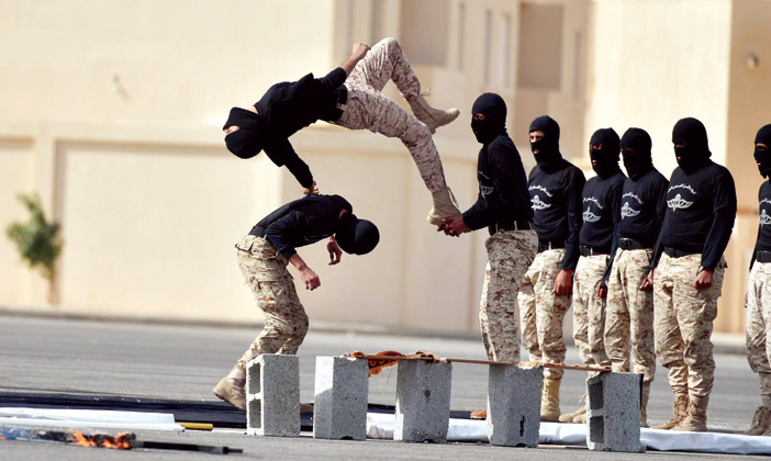 عقب ذلك قدمت وحدات اللواء الخاص الأول التمرين الأول للواء الأمن الخاص في قرية التدريب الأمنية عرضاً عسكرياً عن المهارات الفردية لعدد من الضباط والأفراد.. ثم مهارات القتال بالأيدي ومهارات النزول.. ثم فرضية عملية إبطال متفجرات في أحد المواقع المدنية ثم قدمت هذه الوحدات فرضية تحرير الرهائن وأشخاص مختطفين ومطاردة مطلوبين وفرضية اقتحام مبنى من خلال طائرات الحرس الوطني ثم قدم مجموعة تمارين بالذخيرة الحية، وقد ساندت طائرات الأباتشي والطائرات العمودية نماذج من المهام.. عقب ذلك أخذ سمو الصور التذكارية مع المشاركين ومعداتهم العسكرية.