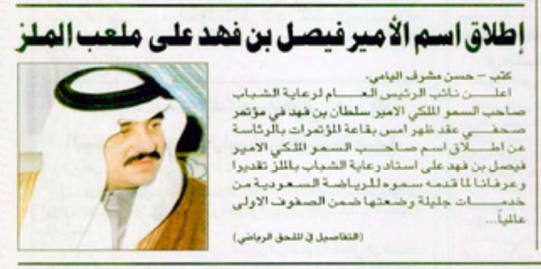 في عام 1997م، أعلن الأمير سلطان بن فهد نائب الرئيس العام لرعاية الشباب عن إطلاق اسم الأمير فيصل بن فهد بن عبدالعزيز على ملعب رعاية الشباب بالملز، وذلك عرفانا وتقديراً لما قدمه أمير الشباب للرياضة السعودية من خدمات جليلة وضعتها ضمن الصفوف الأولى عالمياً.