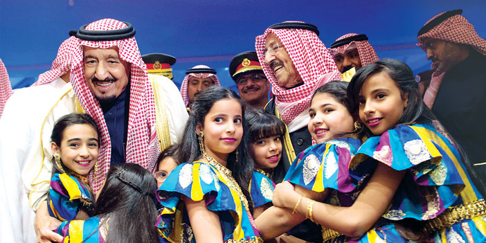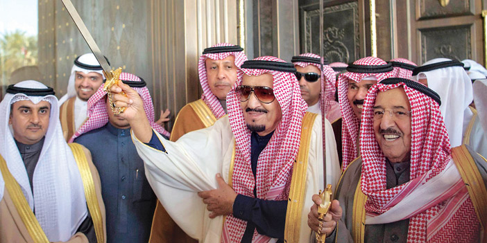 وأمير الكويت خلال الحفل. وشارك الملك سلمان والشيخ صباح جموع المستقبلين بأداء رقصة العرضة، وأشعل الكويتيون مواقع التواصل الاجتماعي بوسم #الكويت_ترحب_بسلمان_الحزم والذي تصدر تريند تويتر. خليجيًا.
