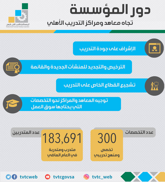 وأوضح المتحدث الرسمي للمؤسسة فهد العتيبي، أن الهدف هو تشجيع القطاع الخاص في الاستثمار بالتدريب كي يساهم في تقديم برامج تدريبية تتوافق واحتياجاته وسد حاجة سوق العمل من القوى البشرية المؤهلة، حيث تقوم المؤسسة من خلال الإدارة العامة للتدريب الأهلي بالترخيص للقطاع الخاص، لافتتاح منشآت تدريبية، والإشراف على جودة التأهيل في تلك المنشآت ومطابقتها لاشتراطات وأنظمة ولوائح التدريب الأهلي، ومن ثم التأكد من جودة المخرجات».