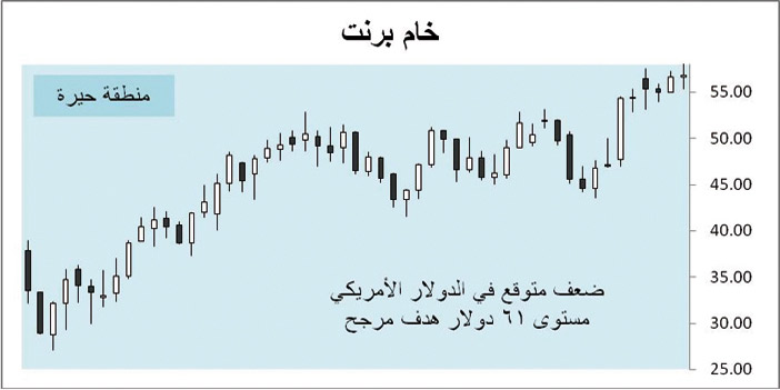 أغلق خام برنت الأسبوع الماضي على نمط بيعي ضعيف داخل منطقة حيرة تزامنت مع حيرة في حركة الدولار الأمريكي لكن الأخير يميل إلى كسر مستوى الدعم 101.5 أمام سلة عملاته مما قد يرفع من أسعار خامات النفط خصوصاً مع بدء تطبيق اتفاق المنتجين مؤخراً الذي منحهم فترة ستة شهور لتخفيض الإنتاج ومع تردد المضاربين في إغلاق مراكزهم وتأجيلها لنهاية شهر يناير الحالي ومستوى 61 دولاراً قد يكون هدفاً مرجحاً.