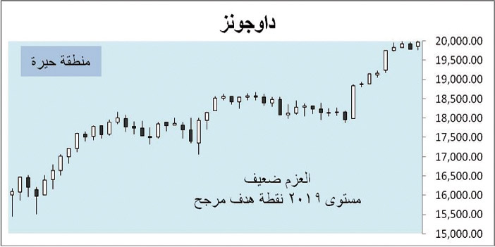أغلق مؤشر الداوجونز الأسبوع الماضي على نمط شرائي ضعيف وتراجع في العزم لكنه تتمكن من تشييد قمة سعرية جديدة عند مستوى 19998 نقطة داخل منطقة حيرة على مستوى الحركة الأسبوعية ويرجح الأسبوع المقبل أن يواصل صعوده إلى مستوى جديد عند 2019 نقطة متزامناً مع ارتفاع قيمة العملة الخضراء لكن بشكل عام يظل السوق يعاني من تراجع في عزم الاتجاه ومهيأ لتصحيح قوي وارد خصوصاً في الربع الأول.