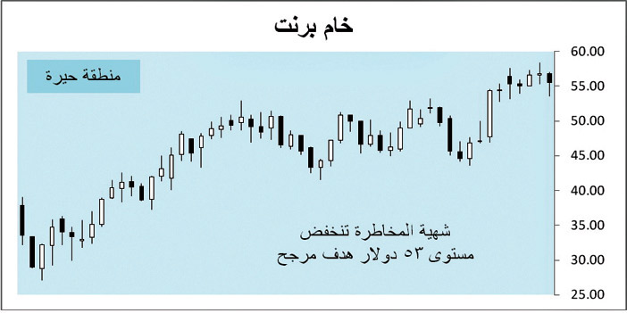 أغلق خام برنت الأسبوع الماضي على نمط بيعي متوسط داخل منطقة حيرة، ولم يساعد ضعف الدولار على رفع سعر البرميل، وهو دليل انخفاض شهية المخاطرة في السوق من قِبل المضاربين. وقد يكون لظهور بوادر عدم التزام من أوبك وخارجها بالاتفاق الأخير دور كبير في الأسعار. ويرجح الأسبوع المقبل أن يكون مستوى المقاومة 56 دولارًا أعلى ما يمكن الوصول إليه، ومستوى الدعم 53 دولارًا الأدنى في حال استمرار جني الأرباح.