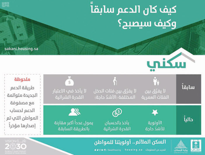 أعلنت وزارة الإسكان عن إطلاق أولى دفعات برنامج «سكني» الذي يتضمّن 280 ألف منتج سكني وتمويلي للتخصيص والتسليم في جميع المناطق، موضحة أن المنتجات تشمل120 ألف وحدة سكنية بالشراكة مع القطاع الخاص متنوعة المساحات بحسب معايير الدخل وعدد أفراد الأسرة، على أن يتم تخصيصها خلال العام الجاري ابتداء من الشهر المقبل، وتسليمها خلال مدة أقصاها 3 أعوام، وكذلك 75 ألف أرض سكنية جاهزة للبناء، إضافة إلى 85 ألف دعم تمويلي مدعوم التكاليف من الدولة، وذلك بالشراكة بين صندوق التنمية العقارية والبنوك والمؤسسات التمويلية.