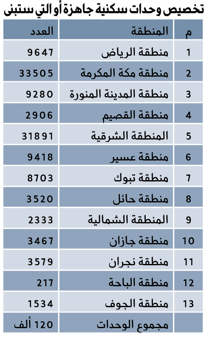وقال زير الإسكان ماجد الحقيل إن تخصيص120 ألف وحدة سكنية متنوعة المواصفات والمساحات بشكل شهري خلال عام وتسليمها خلال 3 أعوام بالشراكة مع القطاع الخاص من تاريخ التخصيص، وتسليم 75 ألف أرض سكنية في مدن عدة، واصدار 85 ألف دعم تمويلي من صندوق التنمية العقارية خلال عام بالتعاون مع البنوك والمؤسسات التمويلية، سيسهم في الإيفاء بنسبة عالية من الطلب السكني على مستوى المملكة، لافتاً إلى أن تخصيص المنتجات سينطلق ابتداء من الشهر المقبل، وسيكون ضمن آلية منظمّة وعادلة ومتوازنة تخضع لمجموعة من المعايير على مستوى جميع المناطق. وكشف الوزير أن حجم الاستثمار في المنتجات السكنية والتمويلية البالغة 280 ألف منتج، يصل إلى 119.5 مليار ريال، بما ينتج نحو 562 مليار ريال كعائدات على اقتصاد المملكة، فيما ستسهم هذه المنتجات في توليد حوالي 47,820 ألف وظيفة مباشرة وغير مباشرة، كما أن القيمة المضافة على الاقتصاد ستكون حوالي 335 مليار ريال، الأمر الذي يأتي تماشياً مع أهداف رؤية2030 وبرنامج التحوّل الوطني.