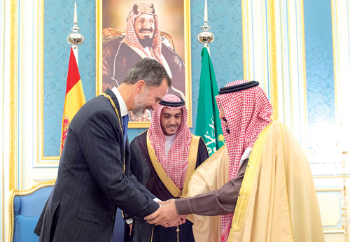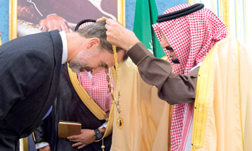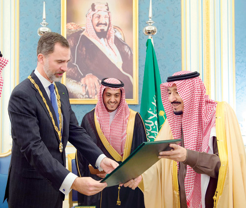 وخلال الاستقبال تفضل خادم الحرمين الشريفين بتقليد جلالة الملك فيليب السادس ملك مملكة إسبانيا قلادة الملك عبدالعزيز وهي أرفع الأوسمة السعودية درجة، وتمنح تكريماً للملوك ورؤساء الدول.