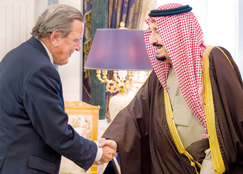 استقبل خادم الحرمين الشريفين الملك سلمان بن عبدالعزيز آل سعود - حفظه الله - في مكتبه بقصر اليمامة أمس دولة مستشار ألمانيا السابق والرئيس الفخري للجمعية الألمانية للشرق الأدنى والأوسط جيرهارد شرودر. وجرى خلال الاستقبال استعراض علاقات الصداقة بين المملكة وألمانيا.