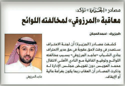 أصدرت لجنة الاحتراف بالاتحاد السعودي لكرة القدم يوم أمس قراراً بإلغاء الاتفاقية التي تمت بين مدير الاحتراف بنادي الشباب ماجد المرزوقي وإدارة النادي الأهلي والقاضية بانتقال الحارس محمد العويس من الشباب إلى الأهلي، إضافة إلى إيقاف مدير الاحتراف بنادي الشباب لمدة عام وتغريمه 300 ألف ريال سعودي وإلزام نادي الشباب بإعادة أي مبلغ تم دفعه من الأهلي.