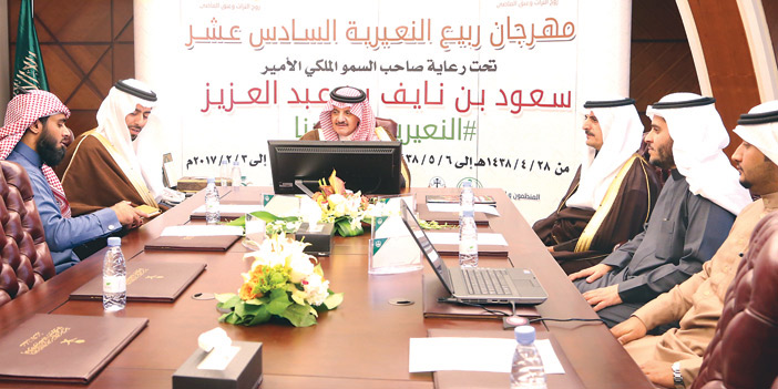 إلى ذلك أكد الأمير سعود بن نايف بن عبدالعزيز، أهمية المحافظة على التراث والإرث الحضاري لمحافظة النعيرية التي تميزت به وجسدته من خلال هويتها في مهرجان ربيع النعيرية، مبينا سموه بأن محافظة النعيرية مركزاً مهماً للربط بين شمال المملكة وشرقها منذ القدم، كما استطاعت جذب الزوار والمتنزهين من خلال ما تقدمه من برامج وفعاليات متميزة على مدار العام. وبيّن سموه خلال تدشينه بمكتبه بديوان الإمارة لمهرجان ربيع النعيرية السادس عشر بحضور محافظ النعيرية رئيس اللجنة العليا المنظمة للمهرجان إبراهيم الخريف، وعدد من أعضاء اللجنة المنظمة، بأن المهرجان يعتبر بوابة لإبراز معالم المحافظة ومنتجاتها التي حافظ عليها الآباء والأجداد، حتى أصبحت وجه مفضلة لدى الكثير، داعياً سموه القائمين على المهرجان بالمحافظة على التراث الحضاري وإبرازه للزوار والمتنزهين بطريقة جيدة، وكذلك فتح المجال للأسر المنتجة في المحافظة.