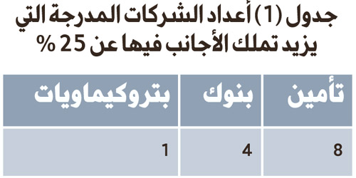 يوضح الجدول (1) أن عدد الشركات التي يزيد تملك الأجانب فيها عن 25 % يصل إلى 13 شركة، منها 8 بقطاع التأمين و4 بنوك وشركة واحدة للبتروكيماويات، ويلاحظ أن قطاع التأمين التعاوني يكاد يكون المسيطر على الشركات التي يتملك بها الأجانب عموما، فأكثر من 30 شركة تأمين بها حصص لأجانب في رأسمالها.. وبوجه عام، أعلى هذه الحصص تأتي في شركة متلايف إيه أي جي العربي التي تصل نسبة الأجانب فيها إلى 40.3 % يليها بوبا العربية بنسبة 34.7 %.