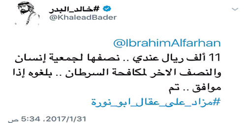 وحظي هاشتاق #مزاد_على_عقال_أبو_نورة أمس بنسبة مشاركة عالية، حتى وصل بعد ظهر أمس إلى ترند السعودية، وكذلك الحال في متابعة الجمهور لكافة فقرات الحفل ليل أمس الأول عبر هاشتاق #حفلة_جدة_الغنائية.