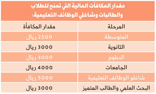 - يرشح للحصول على الجائزة الأول والثاني في كل صف للمرحلتين المتوسطة والثانوية، في مدارس التعليم العام ومدارس تحفيظ القرآن الكريم (بنين وبنات) والمعهد العلمي.