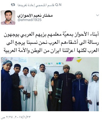 تسعون سنة وهم متمسكون «بكوفيتهم وعقالهم» رمزية كينونة العربي الأبي في وجه المستبد المعربد، عُلقت لهم المشانق ومن يُقاد يُقاد. انفجر الدم الهراق في العشي والإشراق لا لذنب سوى أنهم أقحاح عرب أصحاح، وجوعوا ونهبوا وهجروا وشتتوا وفجروا وثكلوا لكنهم تمردوا على الأصفاد وفكوا القياد وتجشموا القتاد، «عرب الأحواز» أمام ملالي الفرس عباد الدنس, رغم محاولات العدو لتمزيق الهوية وتغيير «التركيبة الديمغرافية» إلا أنهم يصرون على التشبث «بلغتهم الأم» اللغة العربية, مثبتين للعالم أصالتهم التاريخية, ياسُراق «الأطباق الفضائية» ومانعي الطلاب من الذهاب إلى المدارس العربية هناك شاعرٌ قال قصيدة, سببت لكم الريبة, وهناك كتاب قد صدر, وقلم ملحه يُذر, آثارها عندكم شرٌ مستطر. ما لكم كيف تحكمون منذ زمان «العلقمي» في غيكم تعمهون, يا أيها الأحوازيون الأحرار تسنمتم العز في زمن عز فيه عز العرب وعظم المصاب. يا أحرار الأحواز صمودًا صمودًا في وجه الإرهاب.