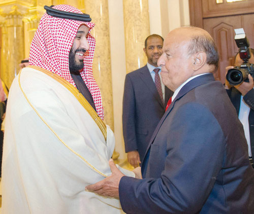 وفي بداية الاستقبال، حمل فخامة الرئيس اليمني، سمو ولي ولي العهد شكره لخادم الحرمين الشريفين الملك سلمان بن عبد العزيز آل سعود على دعمه - حفظه الله- للحكومة والشعب اليمني والجهود التي تبذلها المملكة العربية السعودية ودول التحالف لإعادة الشرعية في اليمن.