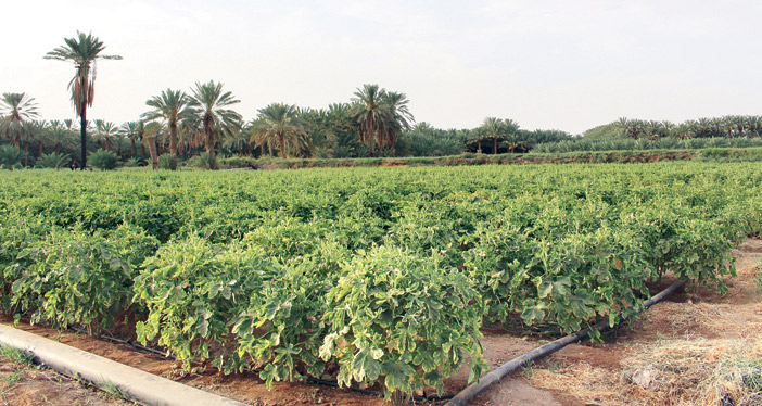 وأضاف: محافظتنا اليوم تتشرف بمقدم سموه الكريم في أرض الزراعة والإنتاج حيث تضم أكثر من 5560 مزرعة لإنتاج مختلف المحاصيل الزراعية، كما أن هناك 4244 مشروعاً زراعياً، فيما يزيد عدد مزارع النخيل عن 1321 مزرعة تنتج ما يفوق 20000 طن من التمور، كما بلغت مساحة المناطق المزروعة بالبطاطس لهذا العام 4000 هكتار بلغ إنتاجها 180 ألف طن. كما بلغت المساحات المزروعة بفاكهة الحبحب «البطيخ» لهذا العام قرابة 1200 هكتار وبلغ إنتاجها (حمولة 30 ألف سيارة). وبلغ إنتاج الطماطم للعام نفسه 63 ألف طن حيث بلغت المساحات المزروعة 250 هكتار، أما البصل فقد تمت زراعة 400 هكتار وبلغ إنتاجها 28 ألف طن.